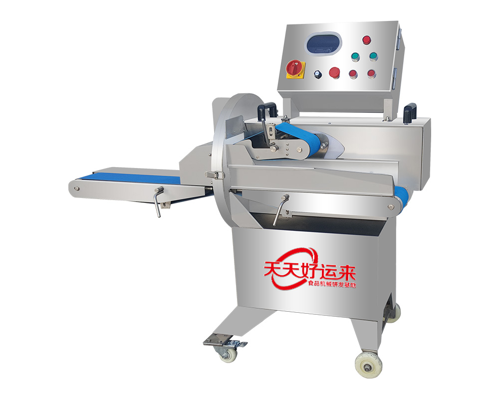 采用特制的兩把刀片能將叉燒肉、鹵味、豬頭皮、豬耳朵、牛肚、肥腸、牛肉等熟肉切成條、片狀,出料口連接輸送帶,使得切出來(lái)的物料擺放整齊,無(wú)需排列可直接裝入托盤(pán)。適用快餐業(yè),超市,大型食堂,食品行業(yè)使用。尺寸:0-40mm(可調(diào))傳送帶寬度:120mm